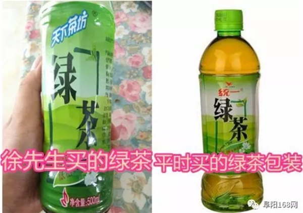 徐先生仔细看了看瓶身,才发现自己买的绿茶并不是市面上常见的品牌,只是在包装上比较像而已。这款绿茶名为天下茶坊,是临泉县一家饮料有限公司生产的,生产日期为2018年5月6日。
