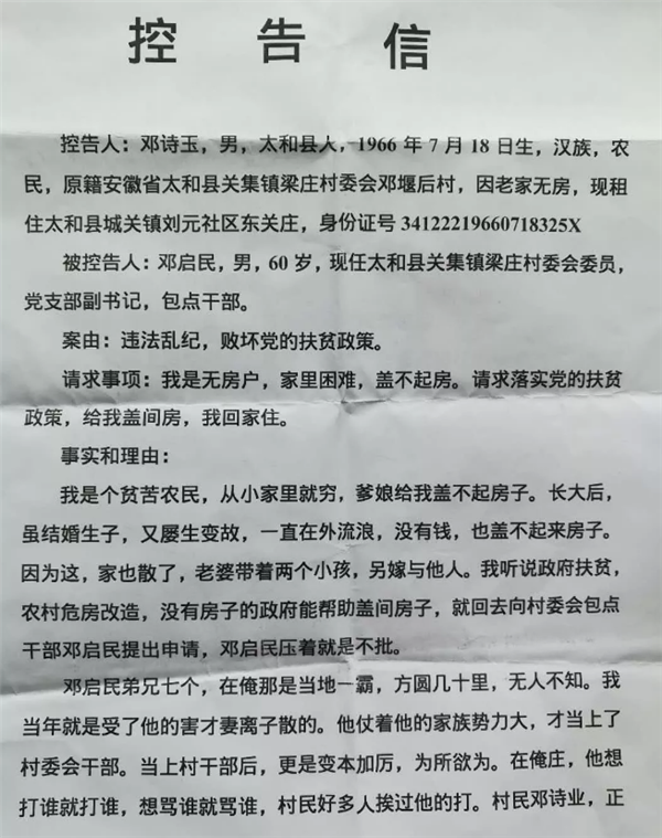 太和县关集镇梁庄村委会邓堰后村村民邓诗玉,近日,网络实名举报该村现任太和县关集镇梁庄村委会委员,党支部副书记,包点干部邓启民,违法乱纪,欺上瞒下,虚假扶贫。