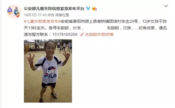 据公安部儿童失踪信息紧急发布平台消息阜阳12岁女孩朱甜甜前天(30日)下午走失朱甜甜,汉族,女,12岁,体重70斤左右;住址:颍上县谢桥镇团结村朱庄子;于2018年9月30日13时20左右在颍上县谢桥